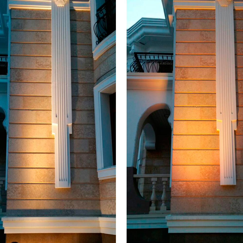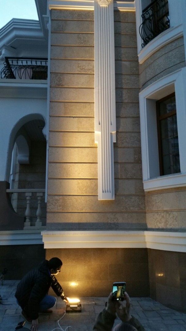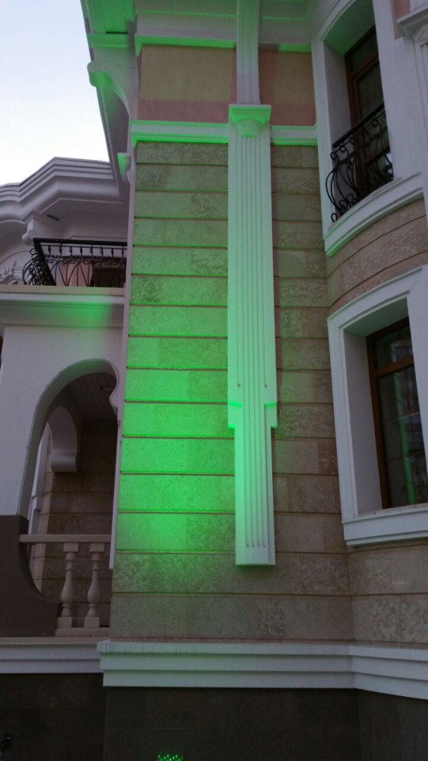 Травертин для облицовки фасада - материал эффектный, недорогой и износостойкий. В дневном свете здание смотрится как сливочное пирожное, воздушное и невесомое. И легко потерять нежные цвета и невесомость, если применить для подсветки фасада неподходящее оборудование, выбрать неправильную цветовую гамму. Смотрите ленту сами: в синем цвете бежевый травертин получает грязный сероватый оттенок. Чистый зеленый цвет дает оттенок болотного цвета. #холодныйбелыйделает фасад невыразительным и визуально плоским. Красный и фиолетовый выглядят нарочито кричащими. Если строение оформлено травертином, или другим материалом в желтоватом, бежевом цвете - #освещение и #подсветка фасада делайте жёлтый или #теплыйбелыйцвет.
