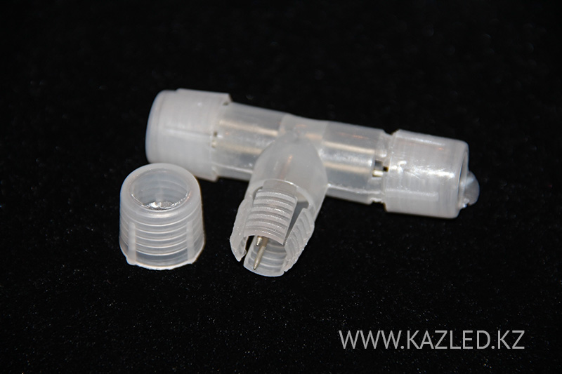 Муфта для соединения под углом 90 градусов трех отрезков 2-жильного дюралайта (круглого). Размер - 11 мм. Цвет - прозрачный.
