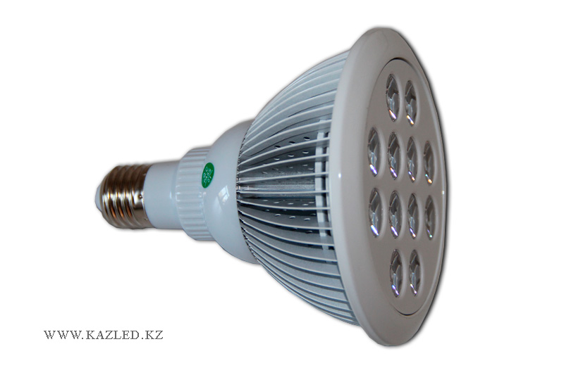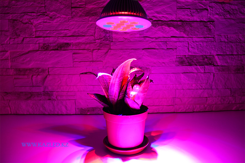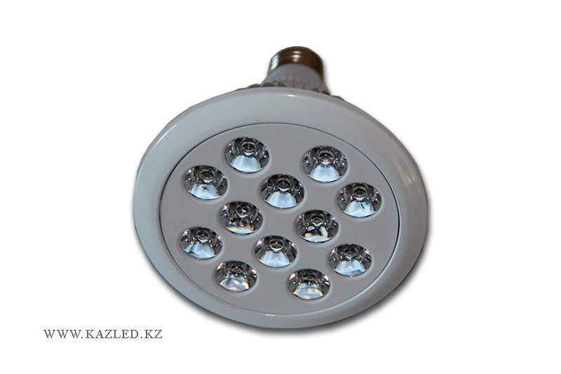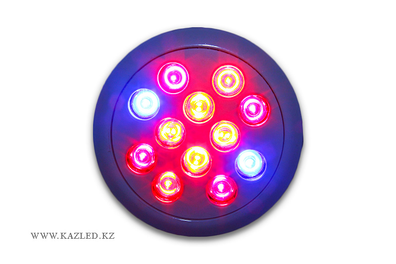 Светодиодный светильник для растений. Размеры: (H)130 мм X (D)120 мм. Цоколь Е 27. Напряжение питания 85 - 265 В (переменный ток). Светодиоды: 10 шт красных, 2 шт синих. Потребляемая мощность 12 Вт. Световой поток 360 Лм.