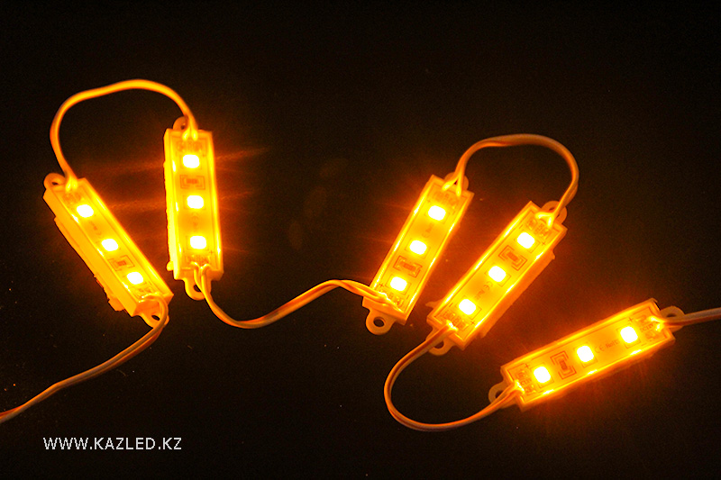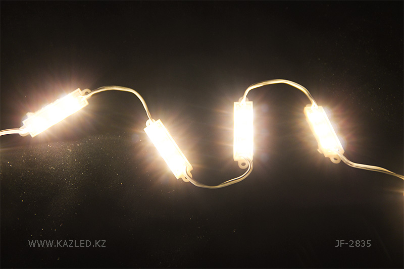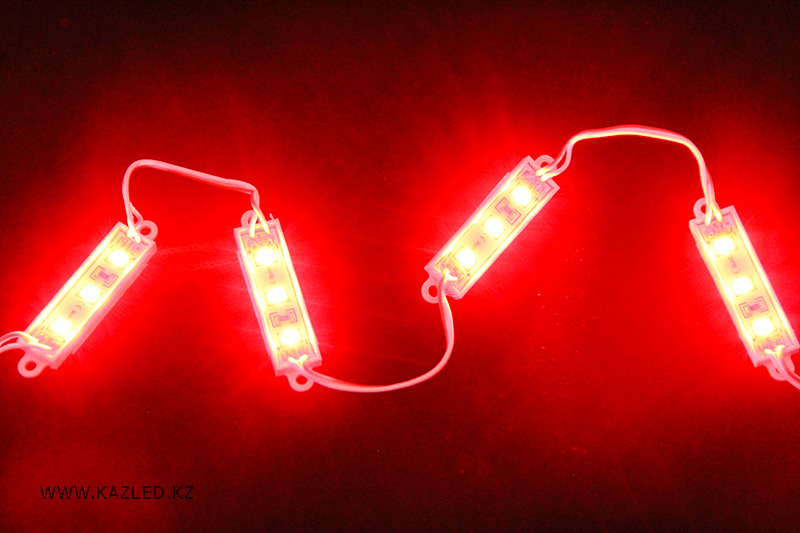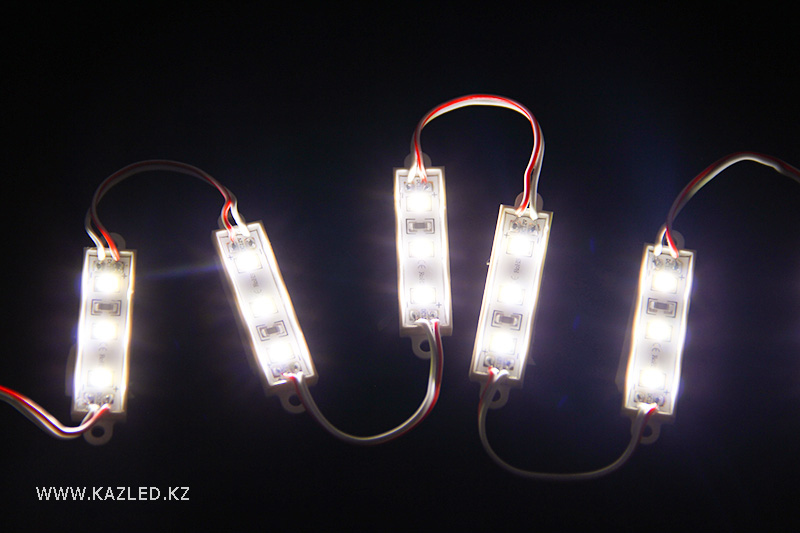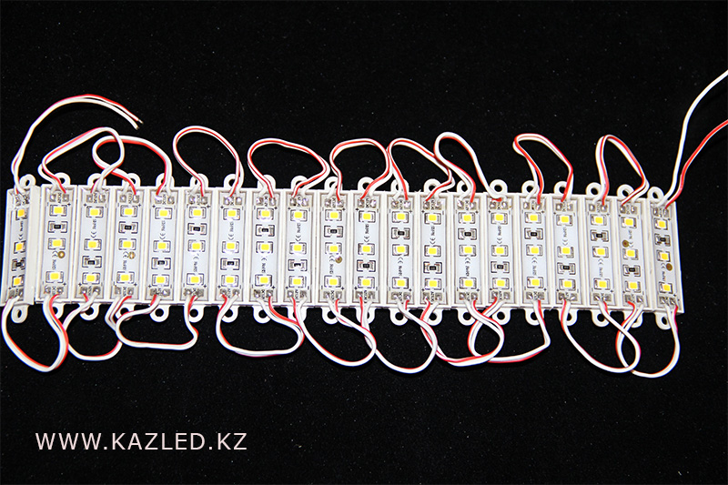Светодиодные модули водонепроницаемые, напряжение питания 12 В. 3 светодиода типа 2835 на модуль. Размеры 38 Х 11 Х 5 мм. Потребляемая мощность 0,36 Вт. Световой поток 34 Лм.