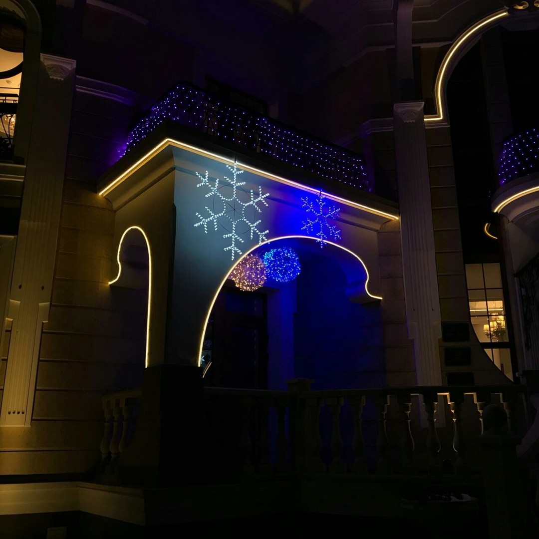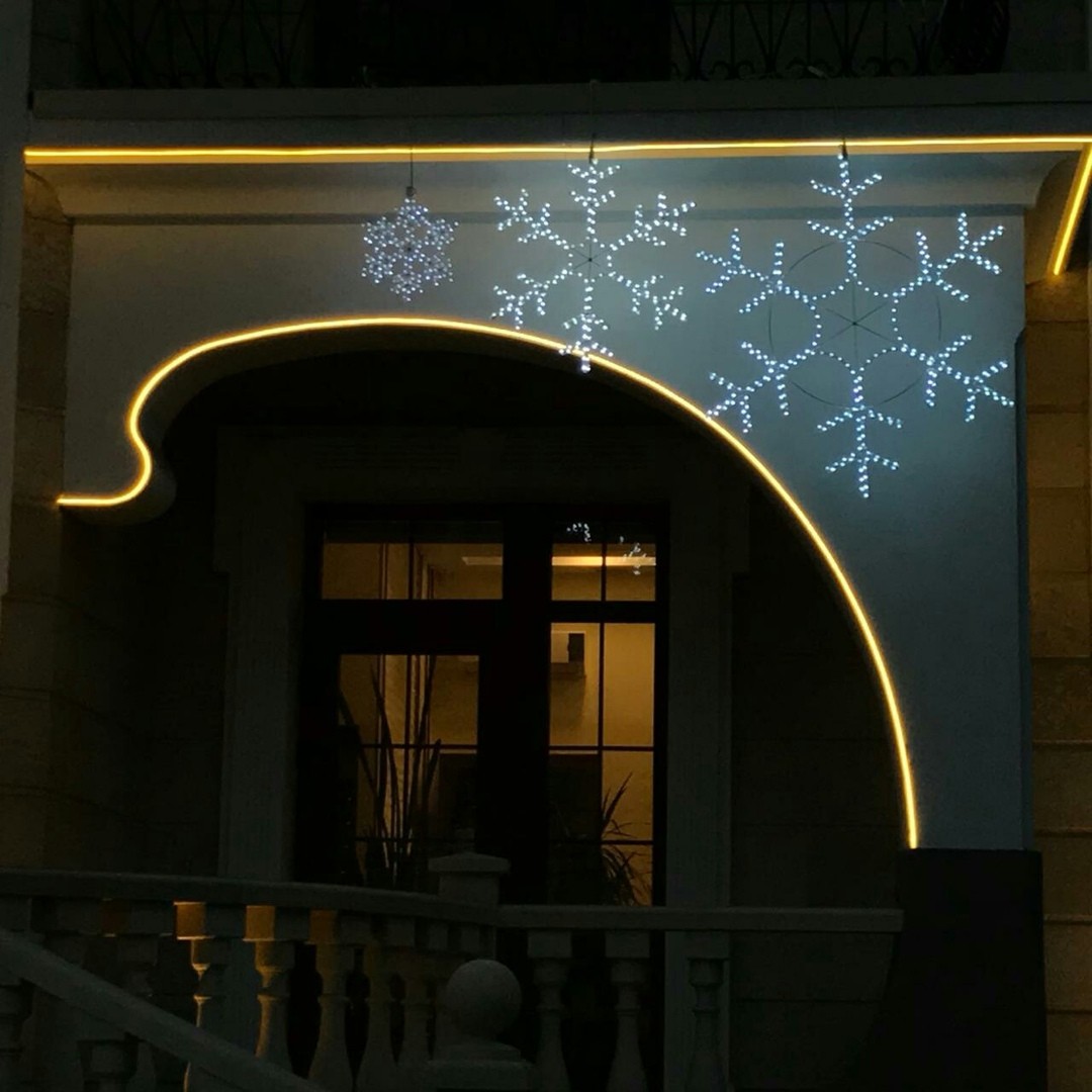 Светодиодная снежинка. Цвет: белый, синий. Металлический каркас. Степень защиты IP 65. Размеры: 80 х 80 см.