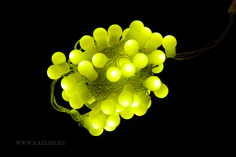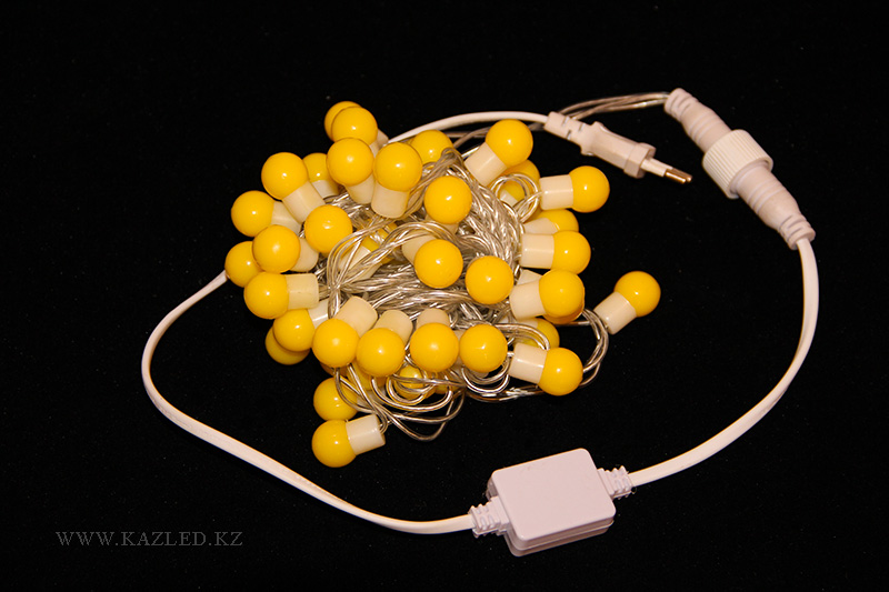 Светодиодный шар. Цвет желтый. Диаметр шарика 17 мм. Длина гирлянды 5 м, шариков - 50 штук. Провод ПВХ 2,2 мм. Рабочее напряжение 220 В. Длина шнура питания 50 см.