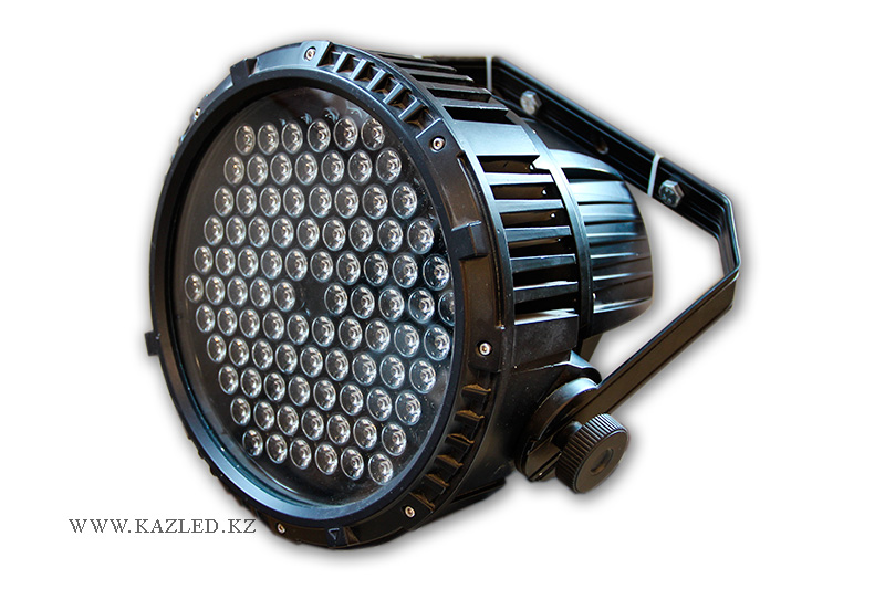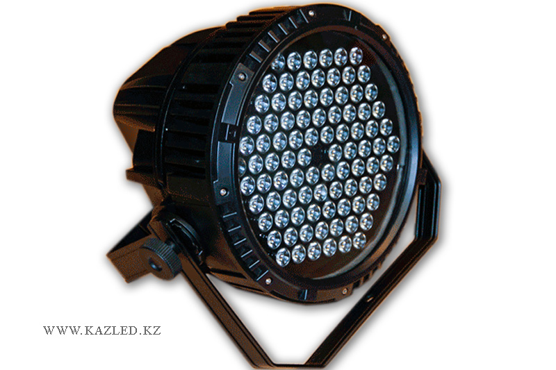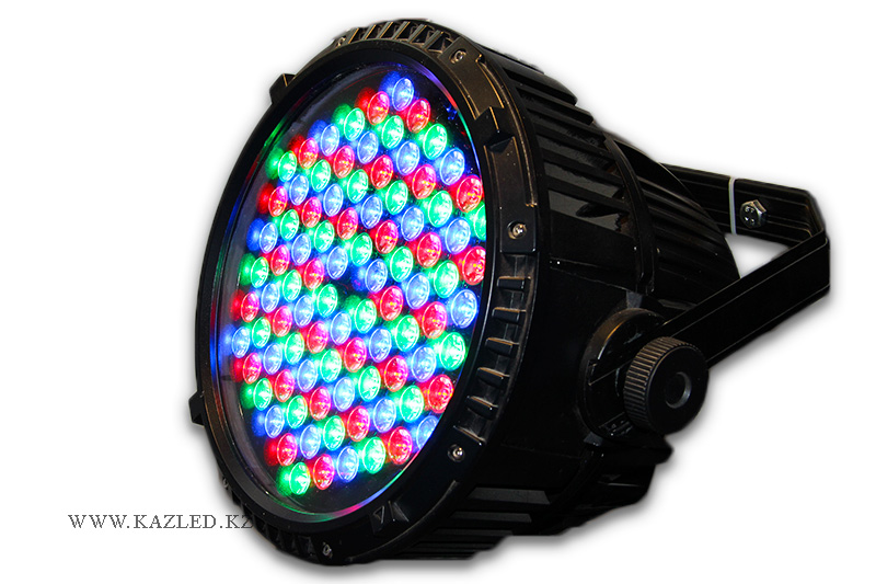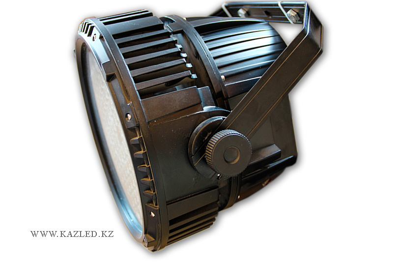 Светодиодный прожектор. RGB (Мультицвет). Потребляемая мощность 180 Вт. Напряжение питания 24 В. Степень защиты IP 65. Угол светового потока 30 градусов.. Блок питания и контроллер в комплект не входят. Корпус - черного цвета