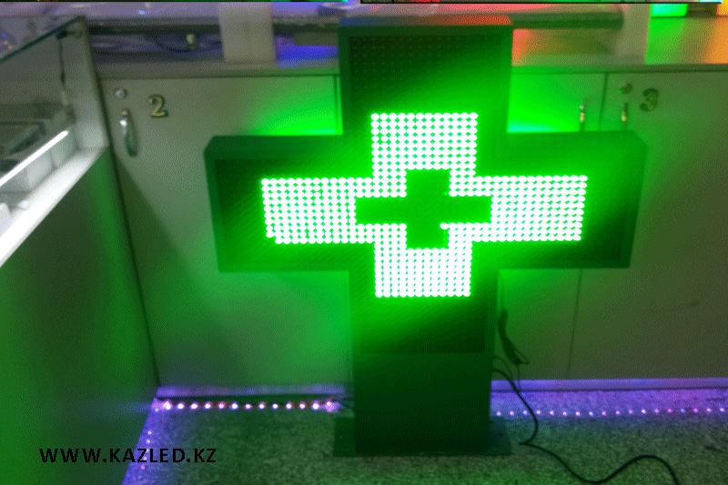 Светодиодный интерактивный аптечный крест. Возможность отображения анимированого текста и изображений. Цвет зеленый. Степень защиты IP65. Двухсторонний. Крепление встроенно.