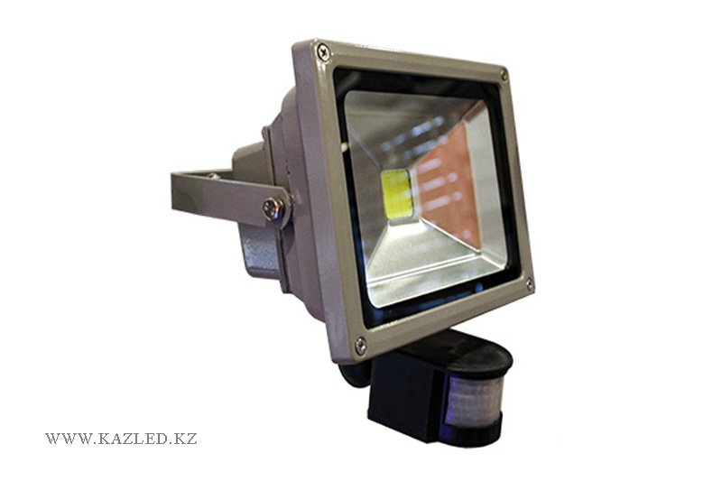 Светодиодный прожектор с датчиком движения. Напряжение питания 220 В. Степень защиты IP 65. Угол освещенности 120 градусов. Холодный белый свет. Потребляемая мощность 50 Вт.